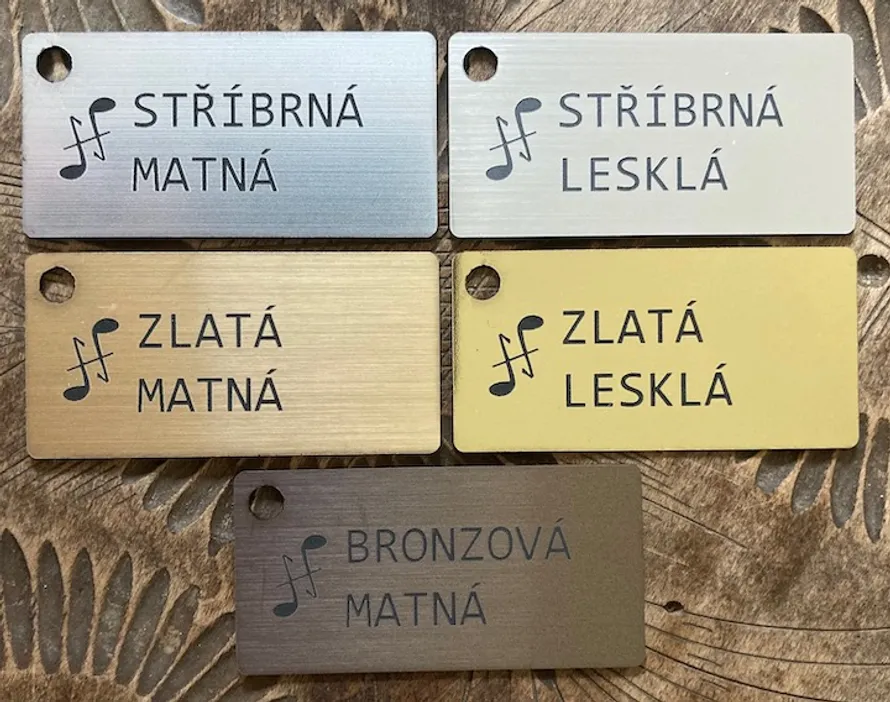 Materiálem je dvouvrstvý laminát na bázi akrylu s povrchovou úpravou kovového vzhledu. Gravírovaný motiv je vždy tmavý, trvalý a nemizí.
